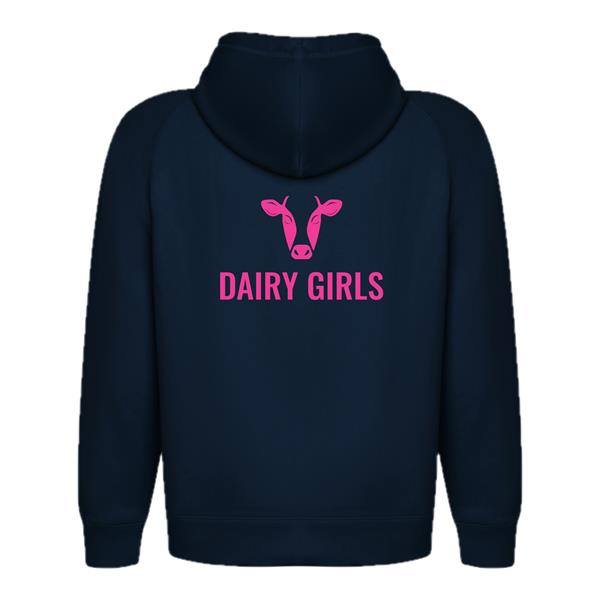 High-quality kids navy hoodieswith kangaroo style pocket , complete with pink and white Grasstec logo on front and Dairy Girls on the back.