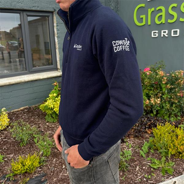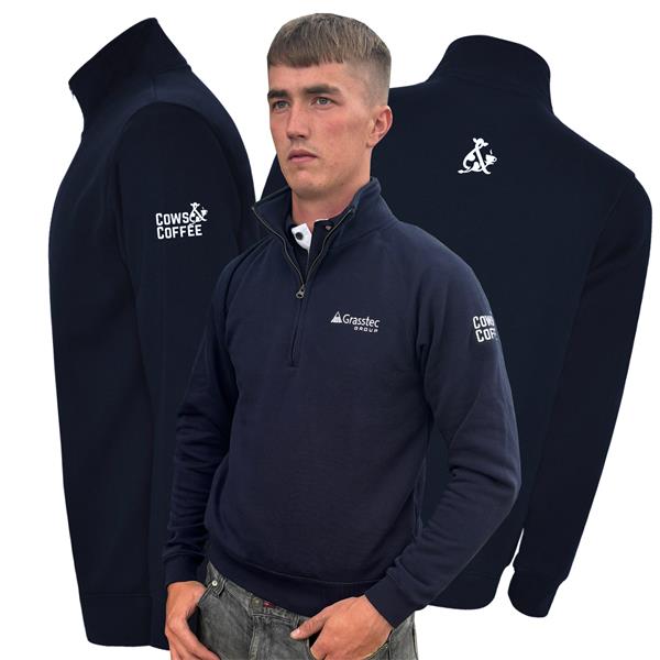 Work hard, stay warm, and look effortlessly stylish with the Grasstec Group “Cows & Coffee” Navy Quarter Zip. Created for farmers who balance early mornings, muddy fields, and a love of good coffee, this premium farming sweatshirt is as practical as it is eye-catching.