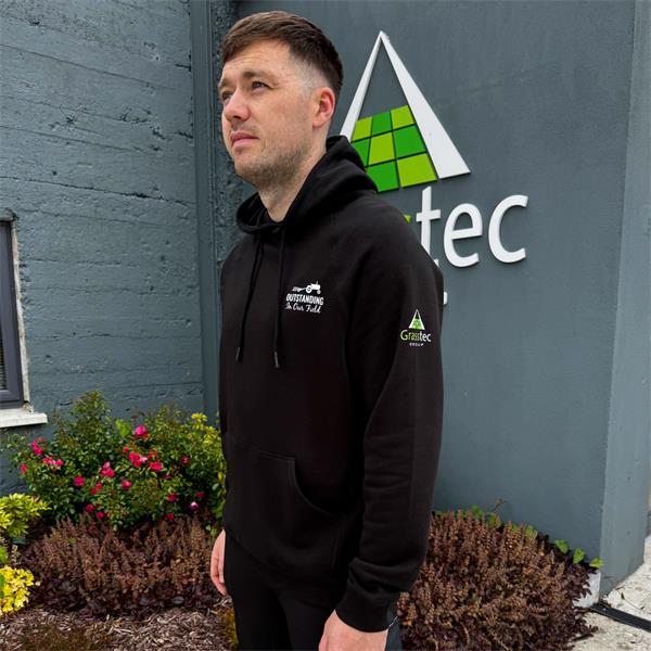 Grasstec Outstanding In Our Field black hoodie. Small "Outstanding In Our Field" design on chest with Grasstec logo on sleeve.
