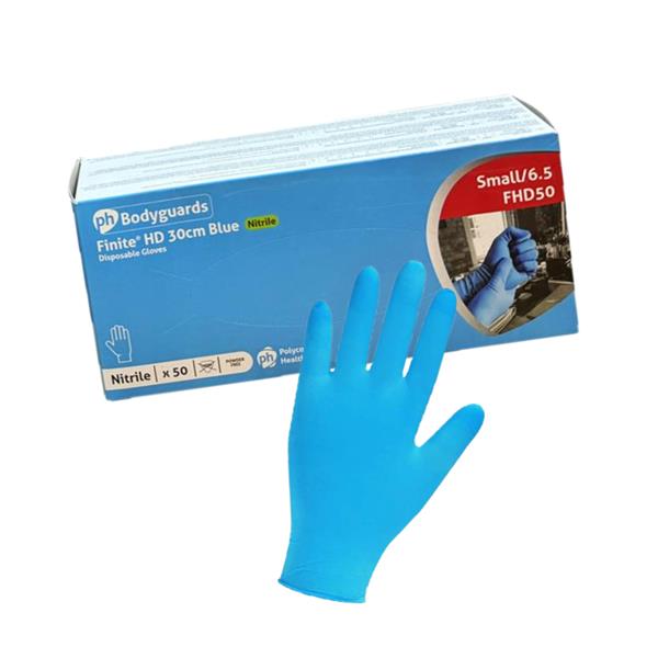 One box of Heavy-Duty Blue Nitrile Powder Free Disposable Gloves. Thicker than a standard disposable, it offers the choice of use as a heavy-duty disposable glove or a lightweight re-usable glove. 50 gloves per box.